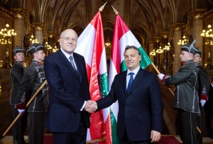 A libanoni miniszterelnök Budapesten Budapest, 2012. november 6. Orbán Viktor miniszterelnök (j) és a hivatalos magyarországi látogatáson tartózkodó Nadzsíb Mikáti libanoni kormányfő az Országház kupolacsarnokában 2012. november 6-án. MTI Fotó: Beliczay László