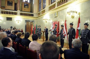 Balog Zoltán, az emberi erőforrások minisztere beszél a Nemzetiségekért Díjak átadása alkalmából rendezett ünnepségen a Parlament Delegációs termében 2012. december 18-án.