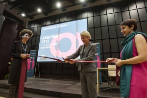 Budapest, 2012. október 18. Annika Nyberg (k), az Eurovízió média osztályának vezetője átvágja az Eurovíziós Akadémia avatását jelképező szalagot a Budapesten, Magyar Televízió épületében 2012. október 17-én.