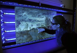 Végvári Zsófia, a Festményvizsgálati Labor vezetője egy 1880-as években készült Munkácsy Mihály-képet vizsgál UV-fényben a XII. kerületi Táltos utcában található laborban 2013. február 7-én. A 2008 óta működő laborban multisprektumú fotográfiai vizsgálatot, roncsolásmentes és roncsolásos anyagvizsgálatokat végeznek. A sztereó mikroszkopós kutatás során felületelemzést végeznek, amelyből kiderül a festék szilárdsága vagy épp frissessége, valamint láthatóvá válik az esetlegesen használt mesterséges öregítés és utólagos szignálás is.