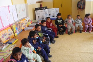 Ar Rasajde, 2012. december 29. Gyerekek ülnek Ar Rasajde település óvodájában 2012. december 27-én. Magyarország adománnyal segített a Betlehem melletti beduin falu óvodáján és iskoláin. Az óvodások szőnyegeket, játékokat és írószereket, fűtőtestet, ventillátort, gyerekruhákat és cipőket kaptak. MTI Fotó: Shiri Zsuzsa