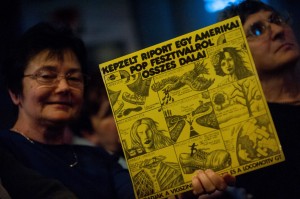 A Képzelt riport egy amerikai popfesztiválról című musical bakelitlemezét tartja a kezében egy résztvevő a negyven éve bemutatott darab az évfordulója alkalmából tartott rendezvényen Budapesten, a Bajor Gizi Színészmúzeumban 2013. január 12-én.