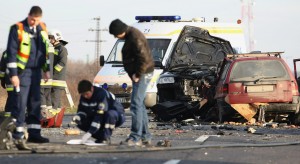 Rendőrök helyszínelnek két összeroncsolódott jármű közelében, melyek frontálisan ütköztek a 4-es főút 164-es kilométerénél, Karcag külterületén 2013. január 6-án. A balesetben a vétlen, magyar rendszámú szamélyautó öt utasa közül négy felnőtt: három férfi és egy nő a helyszínen életét vesztette, míg egy csecsemő, akit életveszélyes állapotban, mentőhelikopterrel szállítottak kórházba a debreceni