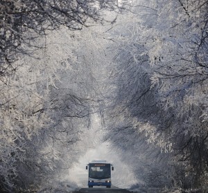 Tél – Debrecen Debrecen, 2013. január 2. Zúzmarás fák között halad egy autóbusz Debrecen határában 2013. január 2-án. MTI Fotó: Czeglédi Zsolt